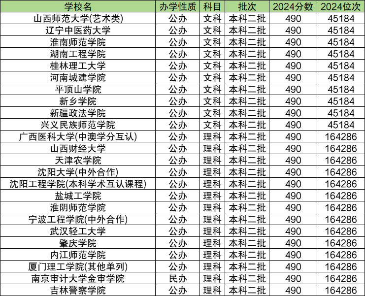 490分的大学一览表(除东南大学成贤学院外,均为公办本科):