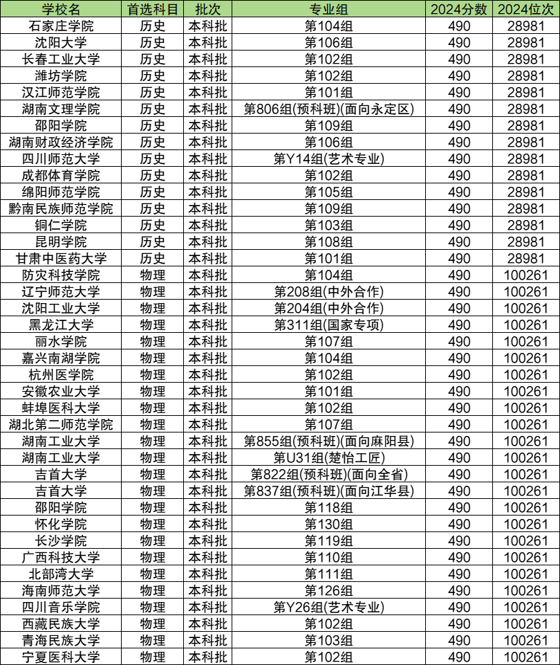 2024年湖南490分省内院校有:湖南文理学院(历史类第806组),邵阳学院(历史类第109组、物理类第118组),怀化学院(物理类第130组),湖南工业大学(物理类第855组、第U31组)等;