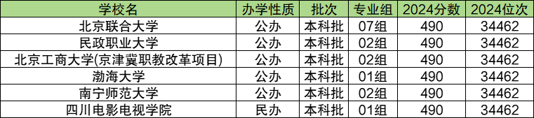 2024年在北京录取分数线是490分的全部都是本科大学,其中有5所都是公办本科院校,只有1所为民办本科。位于北京市内的有北京联合大学、民政职业大学和北京工商大学(京津冀职教改革项目)。
