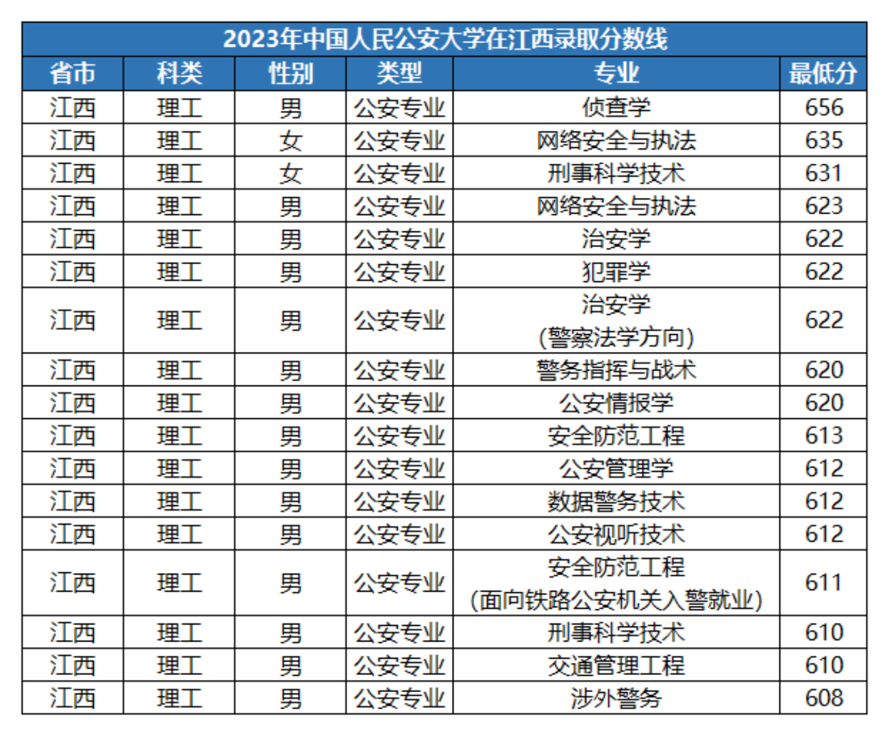 结合江西教考院公布的公安警校招录情况,我们为大家整理了5所部属警校开设的公安专业2023年面向江西文理科考生的分数线,一起来看看在江西高考多少分能被警察院校录取吧!