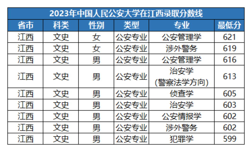 根据该校在江西文科的招录情况来看,2023年最低仅需要599分就能被学校的犯罪学专业录取(只招男生)。而公安大学2023年面向江西文科女生招生的提前批专业只有2个:公安管理学(621分)、涉外警务(619分)。