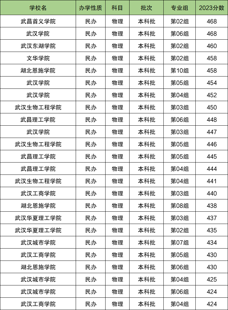 2023年湖北十大民办大学物理类招生分数线范围在424分~468分之间,物理类考生至少要达到本科线(424分)才能报考。