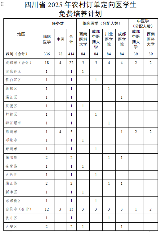 2025年四川定向医学生招生计划为414人,其中西南医科大学临床医学84人、川北医学院临床医学84人等。2024年四川免费医学生录取分数线是:川北医学院457分等。