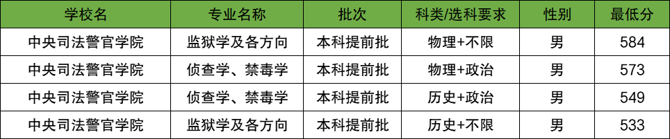 2025年该校公安类专业在福建提前批招生分数中,男生分数最高的专业是物理类监狱学及各方向,2025年最低录取分为584分;男生分数最低的专业是历史类监狱学及各方向,2025年最低录取分为533分。