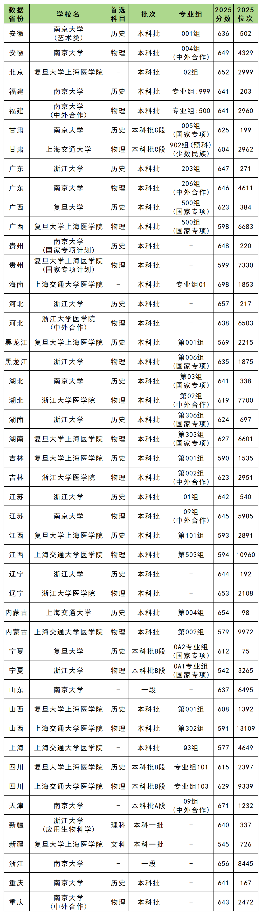 从上文整理的全国华东五校最低录取分数线表,老师发现部分省份录取分数线最低的华东五校都是南京大学或复旦大学,因此下面为大家整理了这所大学在全国各省录取分数线情况。