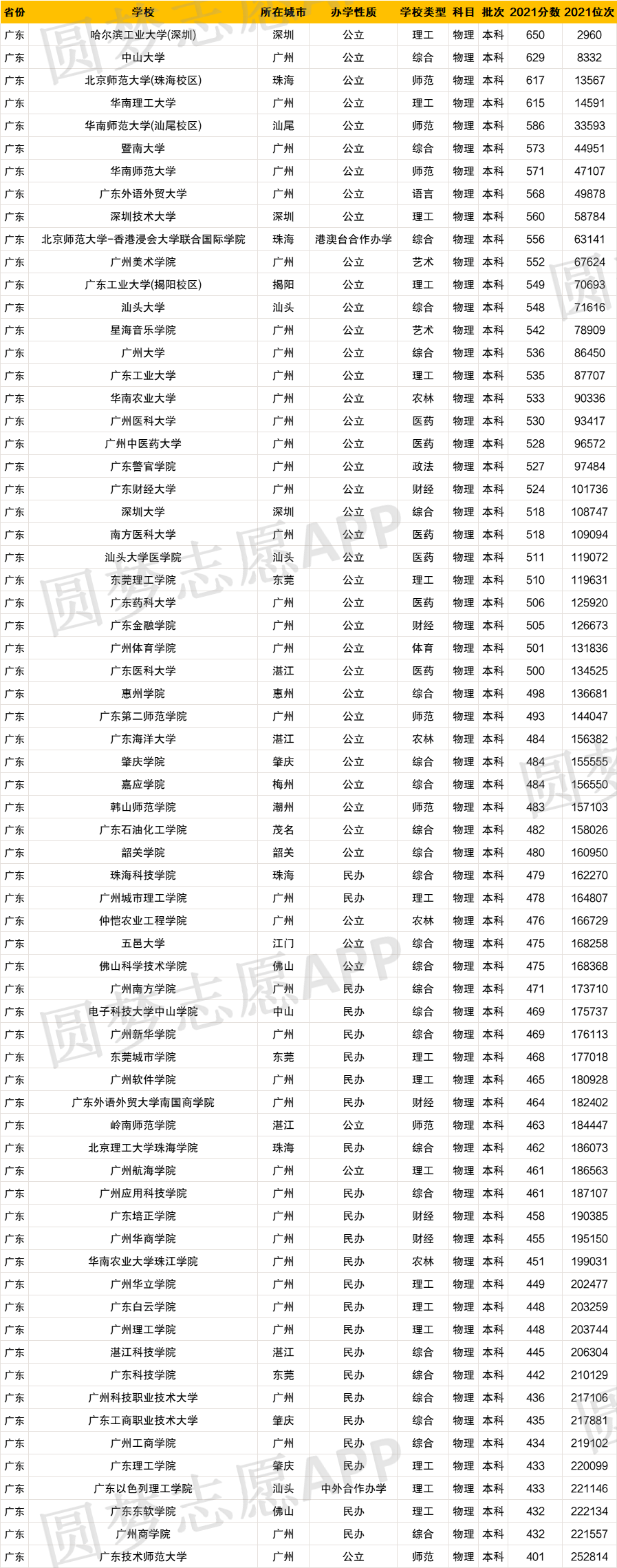 在2021年高考广东省物理类中分数线最高的10所本科大学如下: