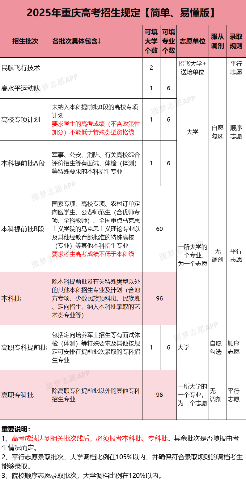 重庆新高考志愿模式为“专业(类)+学校”,本科批和专科批均设置96个平行志愿。