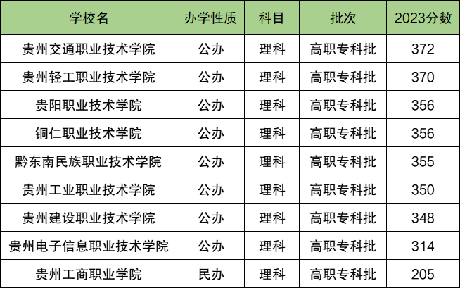 2023年贵州十大专科院校理科招生分数线范围在205分~372分之间,理科考生至少要超专科线(180分)25分以上才能报考。