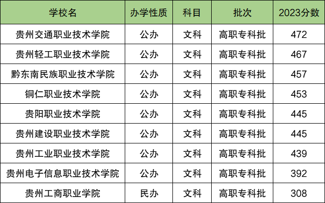 2023年贵州十大专科院校文科招生分数线范围在308分~472分之间,文科考生至少要超专科线(180分)128分以上才能报考。