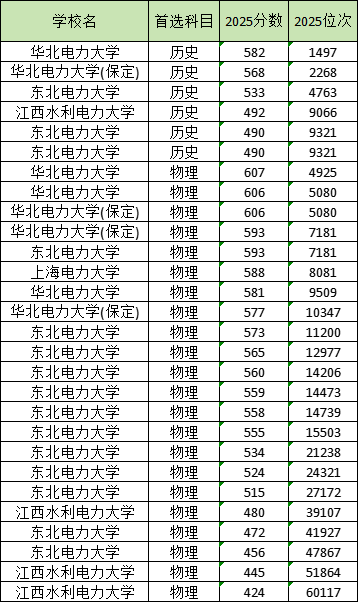 下面为大家附上2025年电力大学录取分数线及位次排名一览表,以供参考: