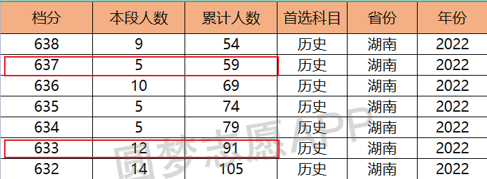 其中“档分”就是2022年在湖南省高考中的分数,“本段人数”就是该分数在2022年湖南高考中的同分人数。