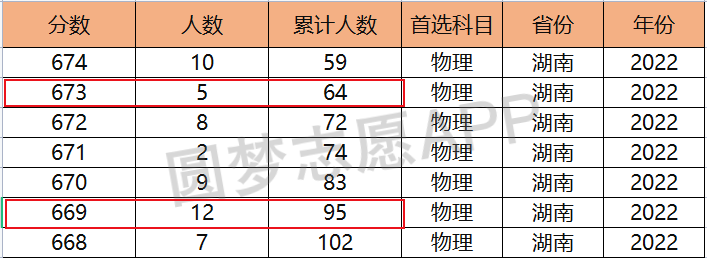 其中“累计人数”就是2022年该分数在湖南省高考中的全省最低排名,“人数”就是该分数在2022年湖南高考中的同分人数。