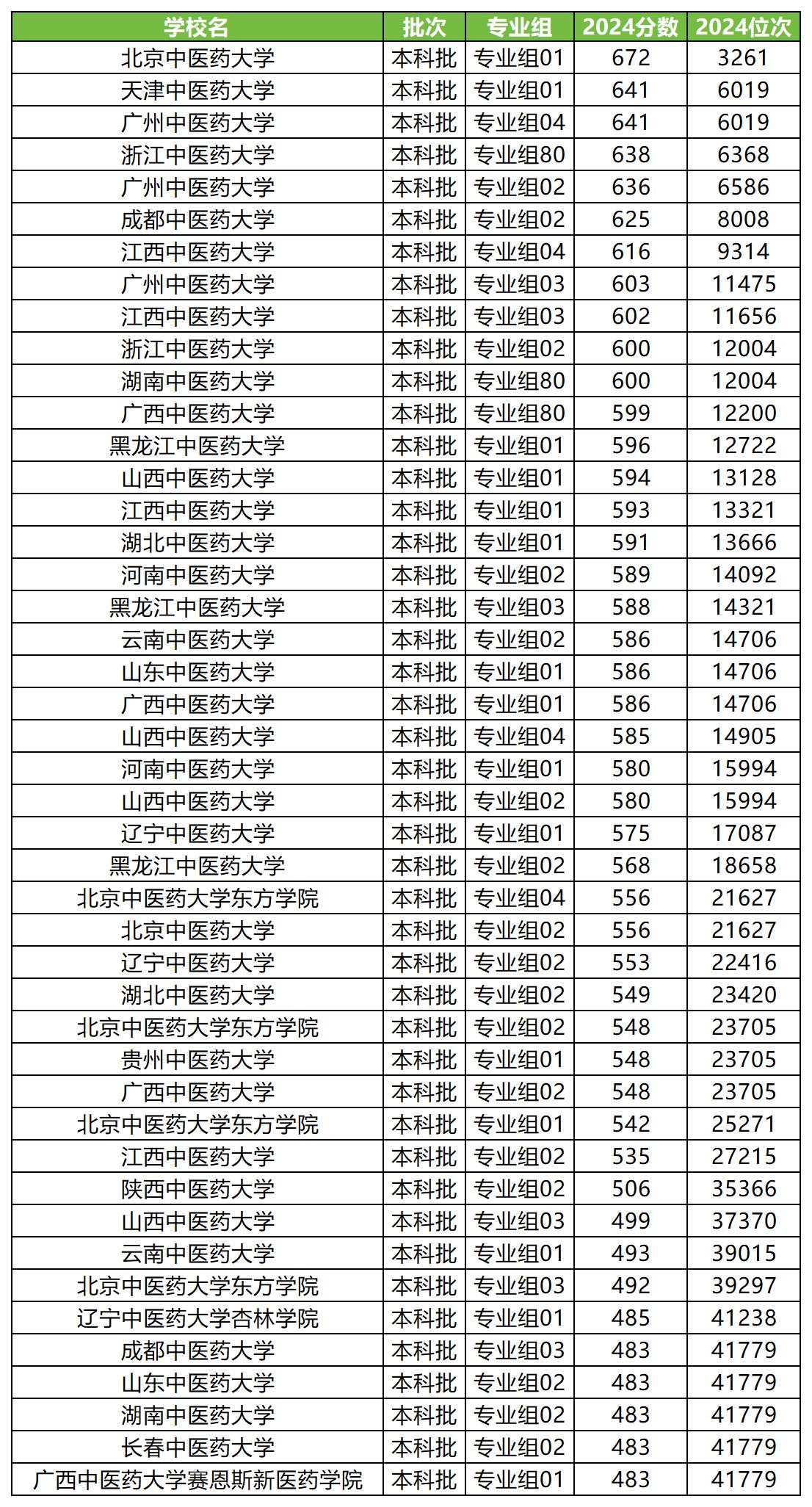 2、2024年中医药大学录取分数线及位次