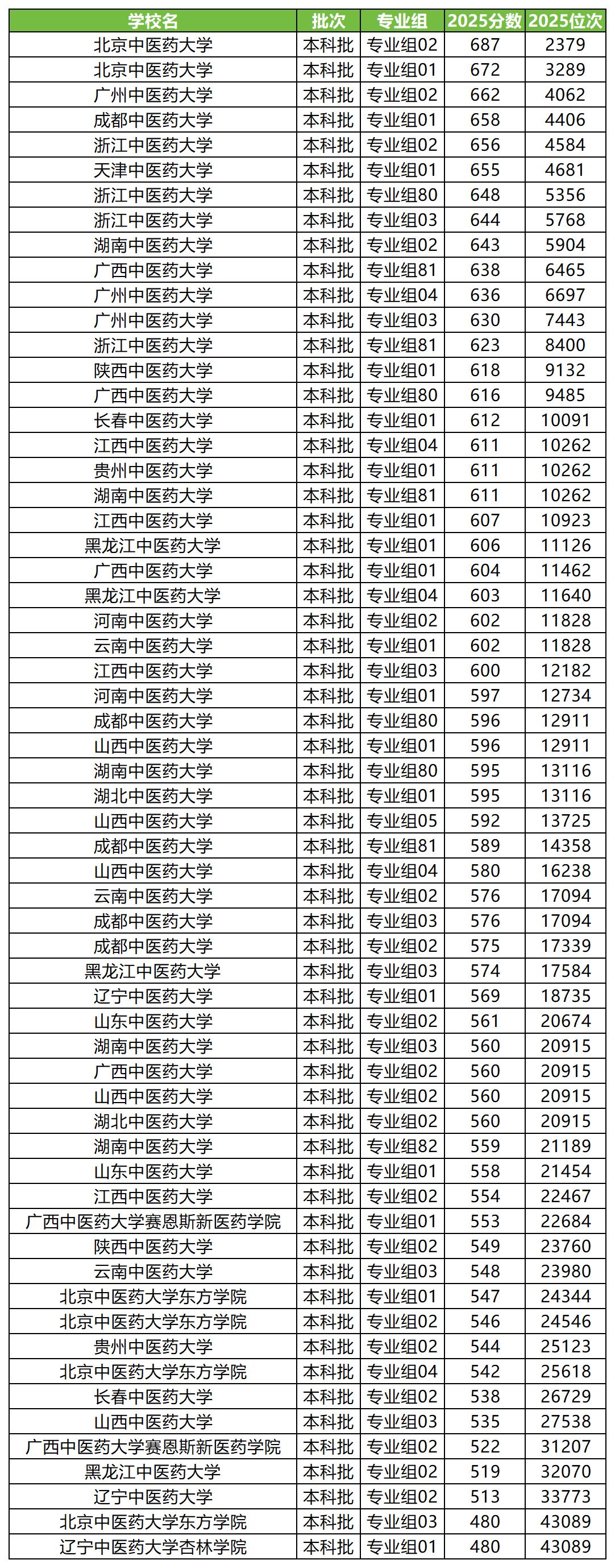 1、2025年中医药大学录取分数线及位次