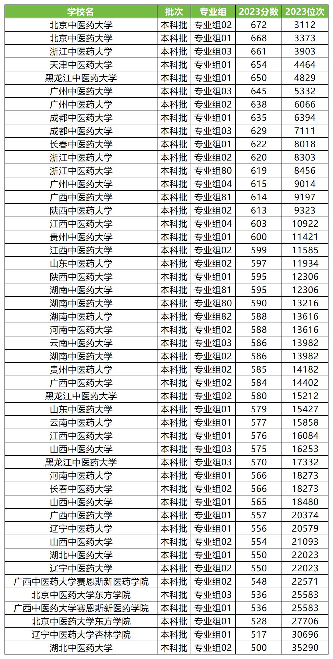 3、2023年中医药大学录取分数线及位次