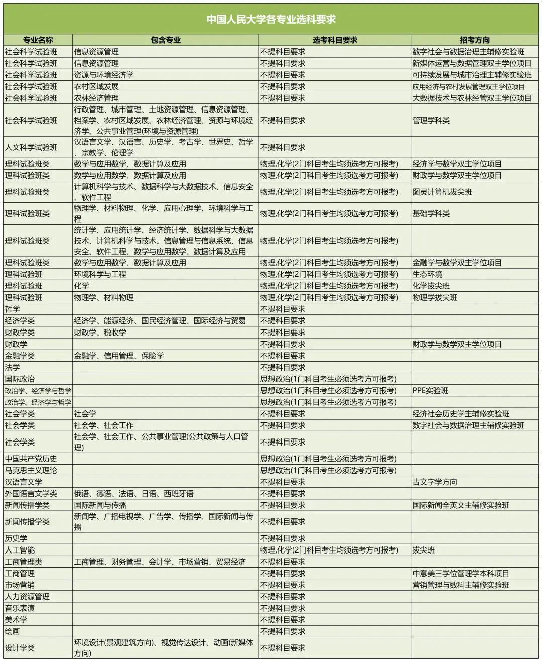中国人民大学理科试验班相关专业要求考生物理和化学均须选考;社会学科试验班、人文科学试验班、哲学、经济学类、财政学类、金融学类、法学等专业不限选考要求;