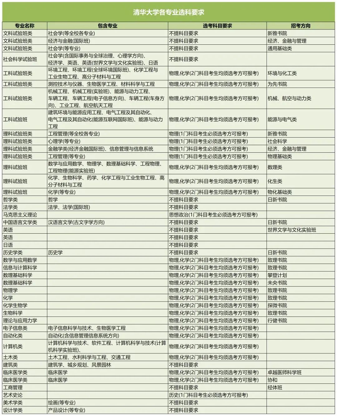 清华大学文科试验班类的专业不限选考要求,但是在学校所有本科专业中所占比例较少。工科试验班类、理科试验班类、电子信息类、计算机类、土木类、建筑类的绝大多数专业要求考生必须选考物理+化学,临床医学类专业要求考生物理和化学均须选考。