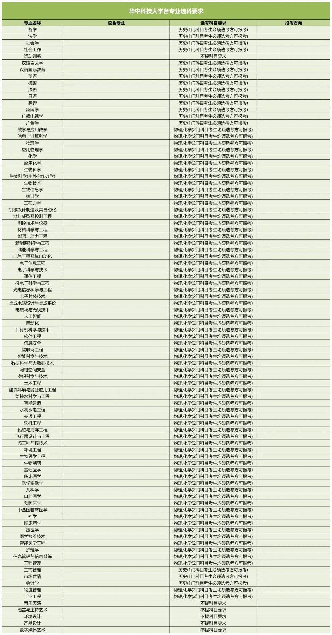以下是华中科技大学新高考选科要求: