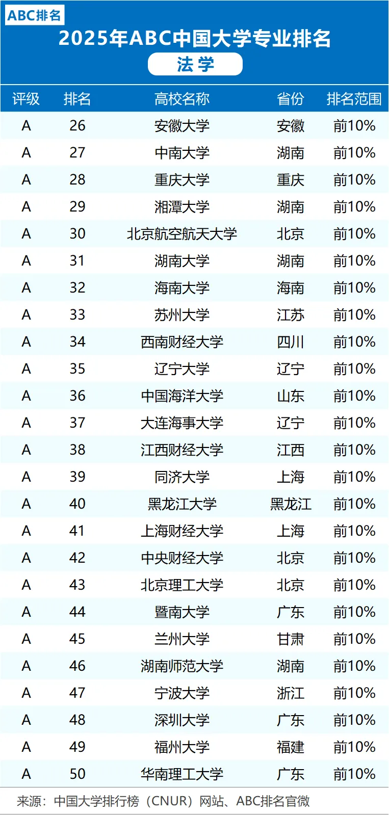 法学最好的50所大学中,有12所学校的全国排名为前2%,其中有5所学校的所在地都在北京市,具体学校是中国政法大学、中国人民大学、北京大学、清华大学、对外经济贸易大学,同时,上海市和湖北省各占两所学校,分别是华东政法大学、上海交通大学、武汉大学、中南财经政法大学。