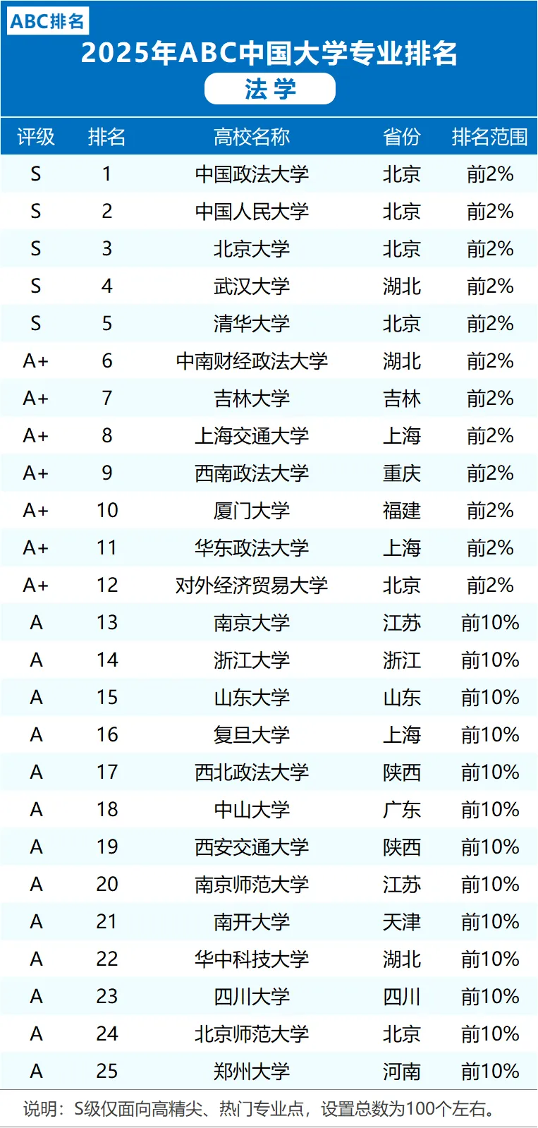 中国政法大学(排名第1)、西南政法大学(排名第9)、西北政法大学(排名第17)、中南财经政法大学(排名第6)、华东政法大学(排名第11)。