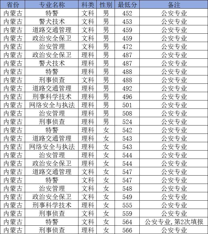 理科分数范围为487-566分,区内考生想要报考该校,分数至少要超一本线16分,即487分。文科分数范围为452-564分,区内考生想要报考该校,分数至少要超二本线71分。和理科相比,文科上内蒙古警察职业学院的分数门槛更低。
