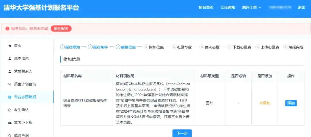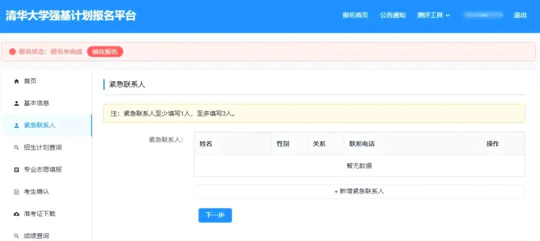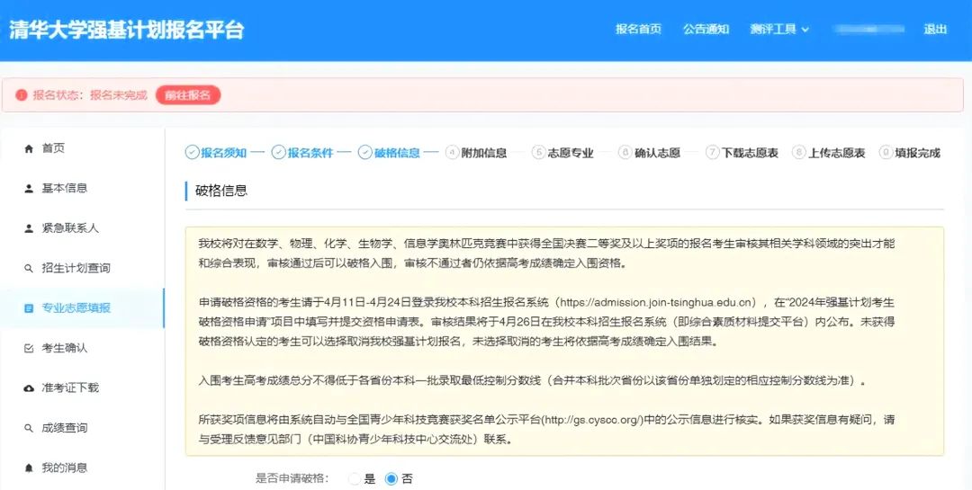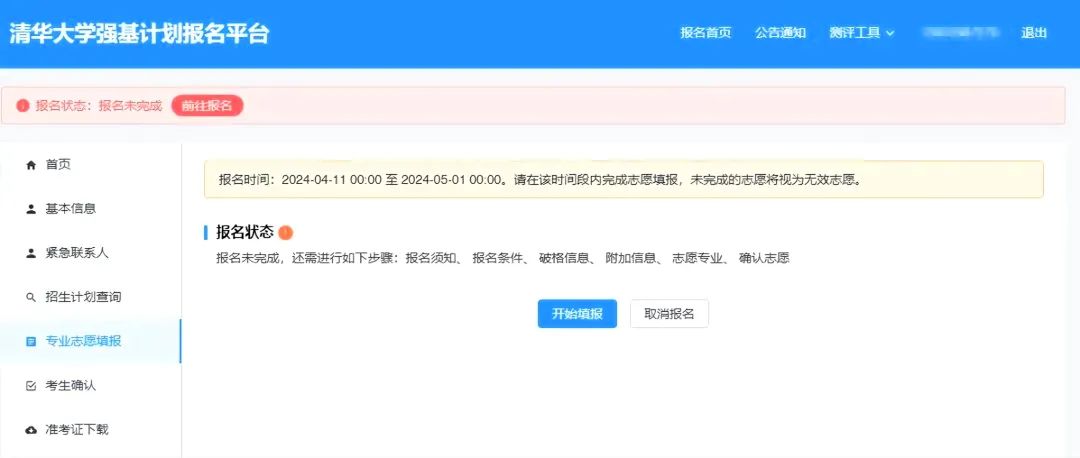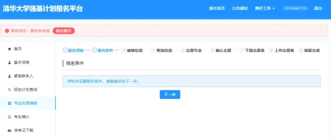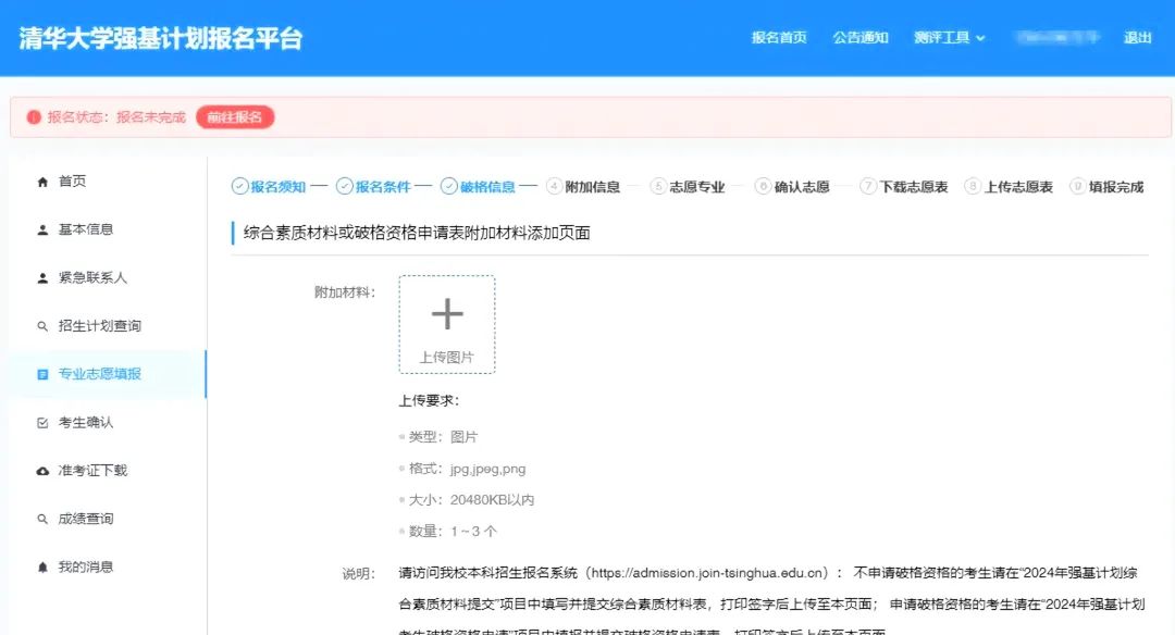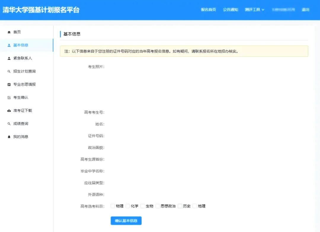 填报信息:填写基本信息、紧急联系人,选择清华大学及志愿专业(最多8个)。