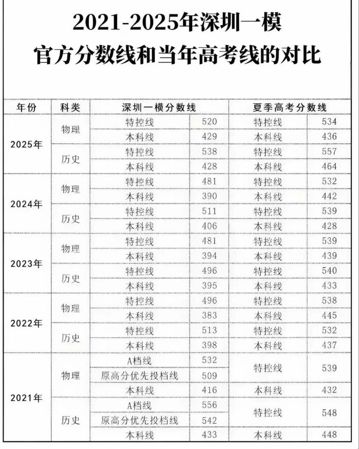 为让大家更直观地了解到深圳一模分数线和广东高考分数线的差距,下面根据往年数据列出近五年(2021年-2025年)深圳一模及夏季高考的分数线,供查阅: