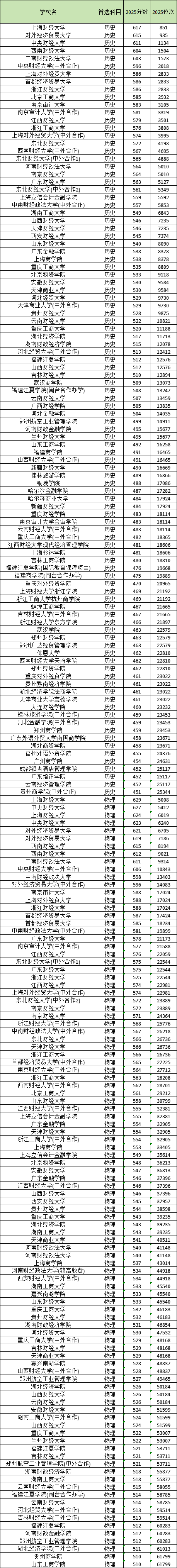 下面为大家附上2025年财经大学录取分数线及位次排名前100强一览表,以供参考: