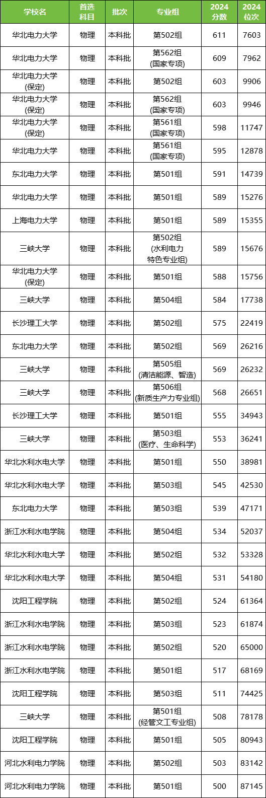 各电力大学最低分数线:华北电力大学(物理类589分、历史类592分),长沙理工大学(物理类555分、历史类571分),三峡大学(物理类508分、历史类562分)。