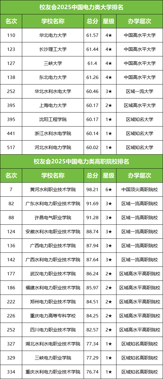 我们通过整理校友会发布的最新排名显示,为大家分析出了排名最靠前的电力大学排行榜名单。最新校友会排名中,一共有下表所示电力大学上榜,其中排名靠前的前五所是:
