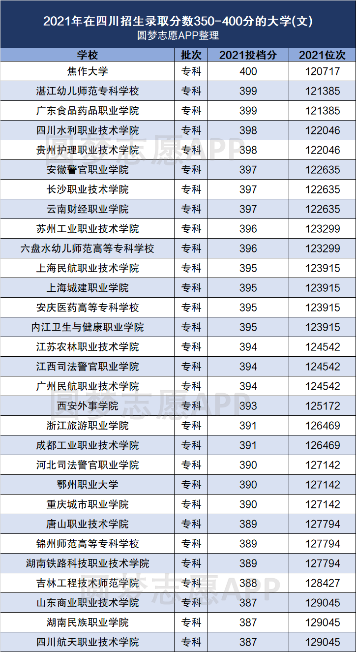 上面就是我们为大家整理的350-400分的大学名单,2021年四川省考生350-400分只能进入专科院校就读。