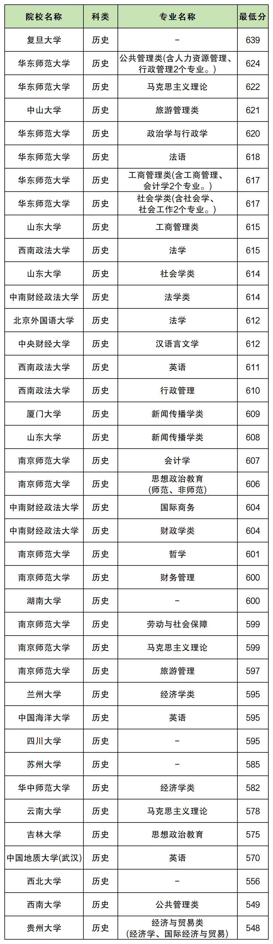 江苏高校专项计划历史类录取分数最低的是贵州大学经济与贸易类(经济学、国际经济与贸易)专业,2024年最低分为548分;相对较低的还有西南大学(公共管理类549分)、江苏师范大学(物流管理556分)、中国地质大学(武汉)(英语570分)等。