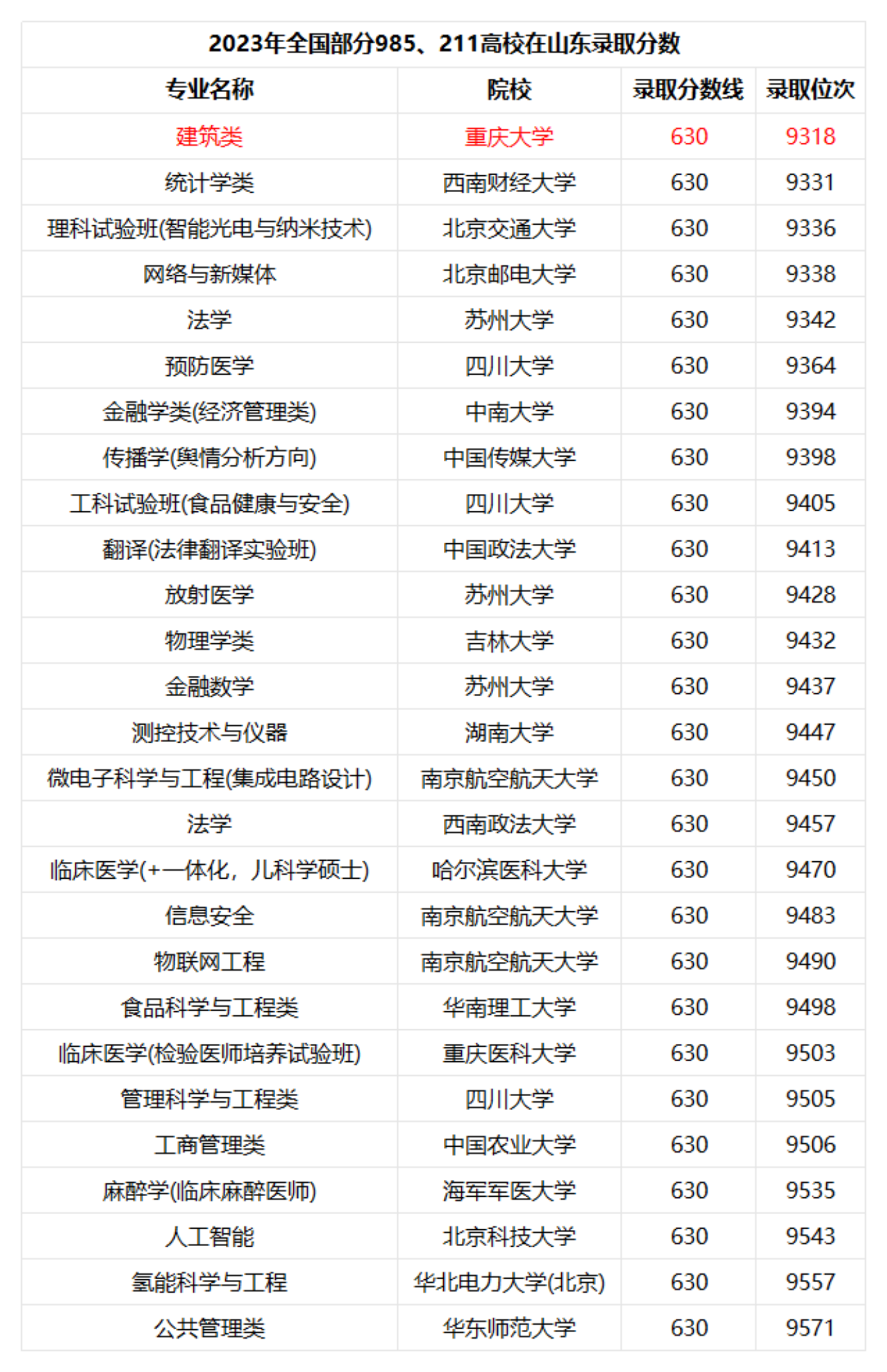重庆大学是“建筑老八校”之一,按理来说建筑专业实力并不差,在2023年的招录情况中,学校的建筑类专业在山东收分630分,录取位次9318名;但根据近年来的就业情况来看,建筑类专业的毕业生就业难度很大,且建筑学专业早已不在高分考生的考虑范围中,如果只是为了985大学的头衔而选择就业劣势的专业,那不妨看看下面几所211院校的专业收分: