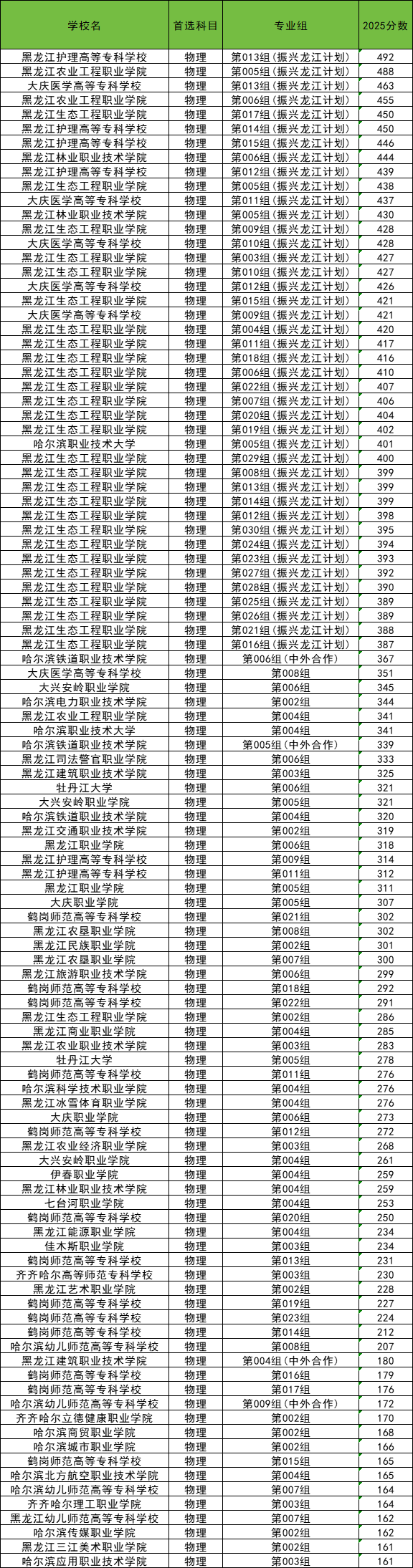 下面是2025年黑龙江省内专科高校物理类录取分数线一览表: