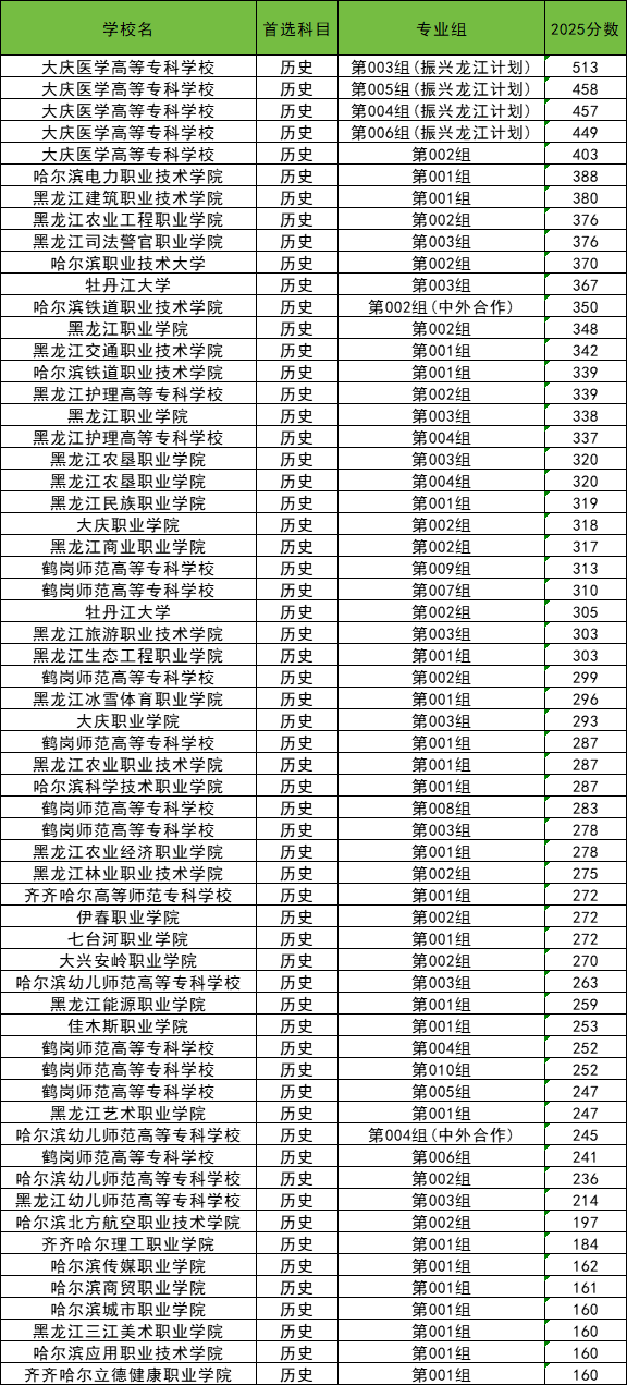 下面是2025年黑龙江省内专科高校历史类录取分数线一览表: