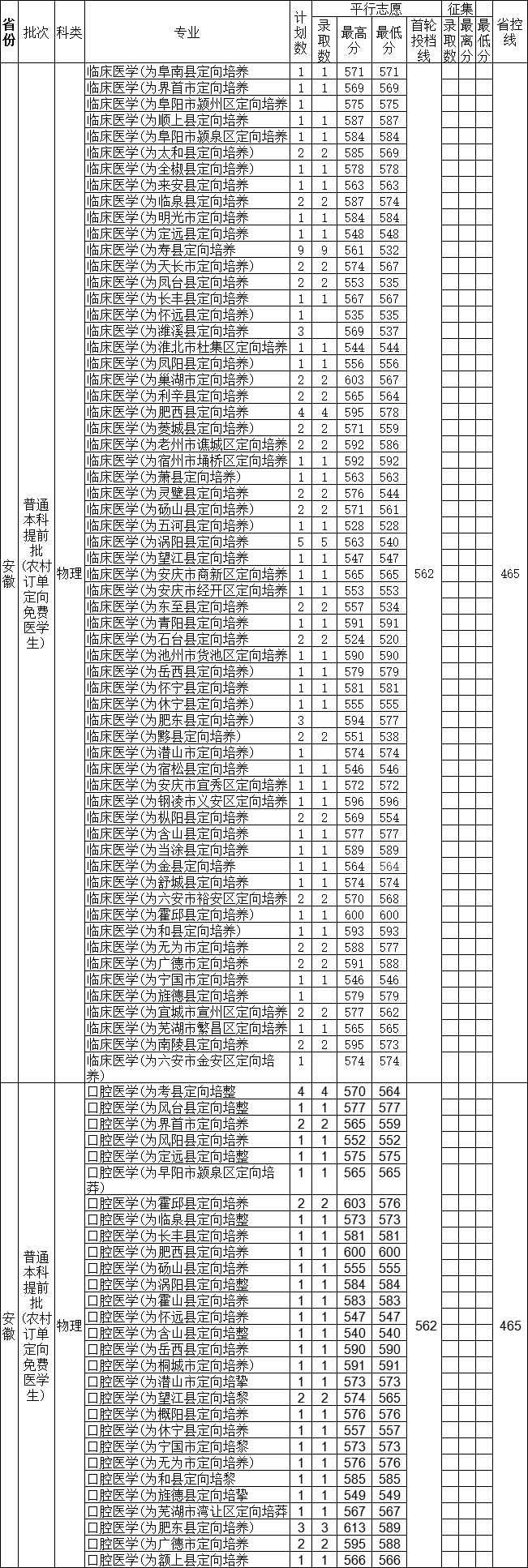 篇幅有限,这里仅以安徽医科大学为例,分析定向医学生招生分数线情况: