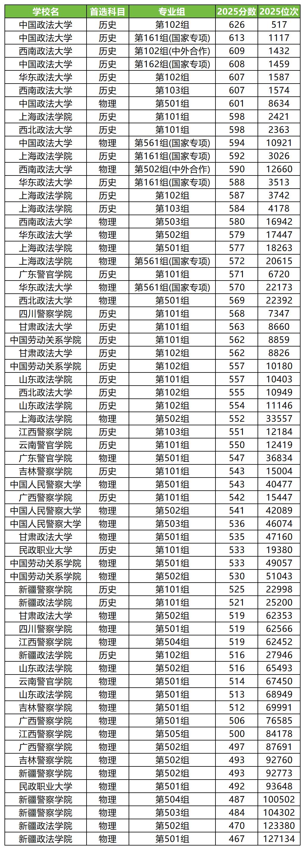 2025年录取分数线最高的是中国政法大学102组,最低626分,位次是517名;另外分数线排在前五的均为历史类专业组,分别是中国政法大学161组和162组,西南政法大学102组和华东政法大学102组,进入前十的还有西南政法大学103组,中国政法大学501和561组,上海政法学院101组,西北政法大学101组。