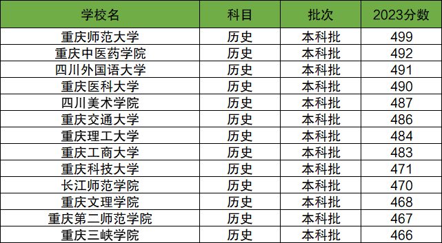 3、450到500分的大学有13所,分数较高的有重庆师范大学(499分)、重庆中医药学院(492分)、四川外国语大学(491分)、重庆医科大学(490分)、四川美术学院(487分),完整列表如下:
