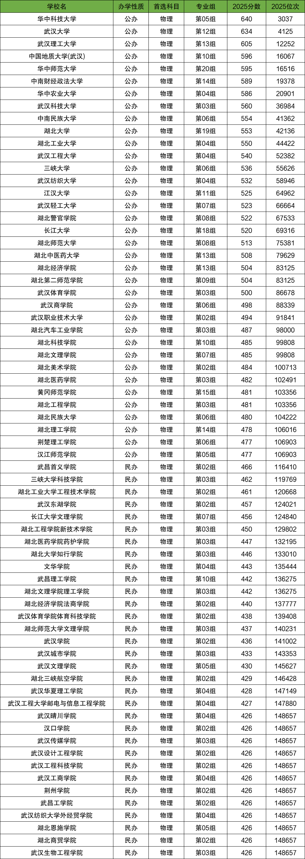 2025年湖北本科各大学在湖北物理类最低录取分数线位于426分-640分范围内,位次位于130214名-3037名之间。