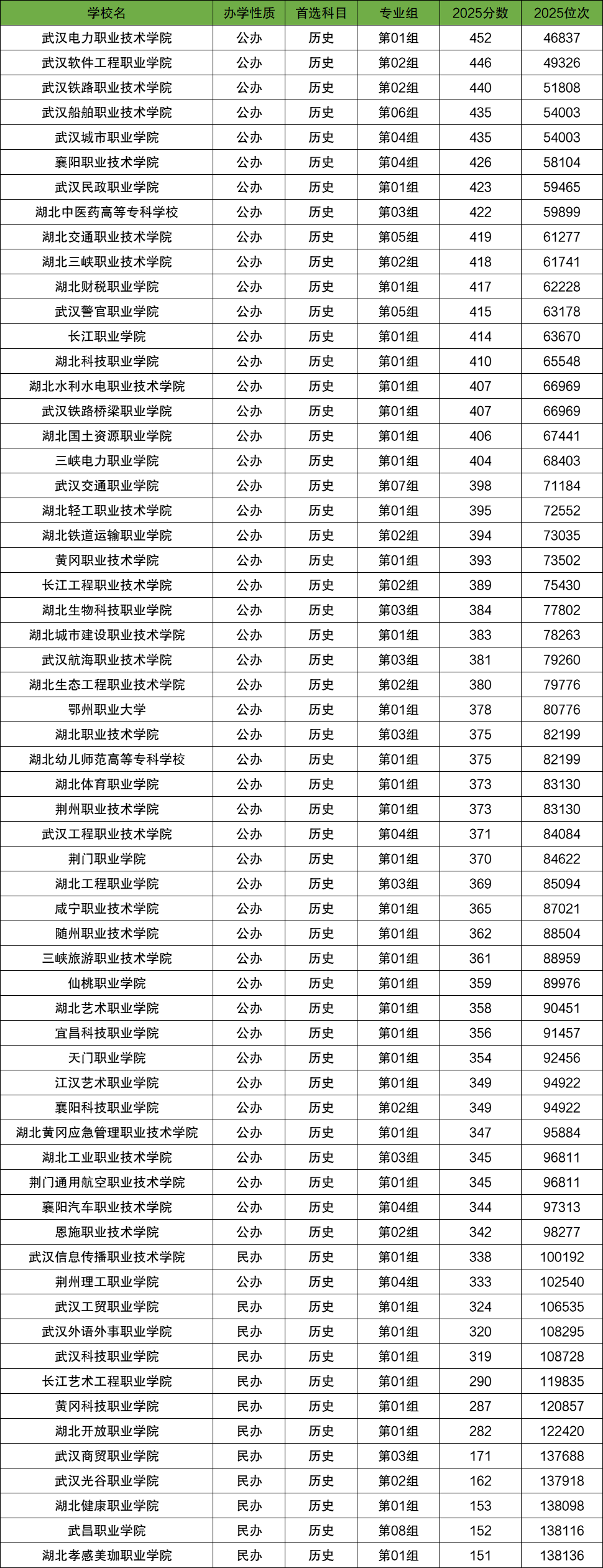 2025年湖北专科各大学在湖北历史类最低录取分数线位于151分-452分范围内,位次位于138136名-46837名之间。