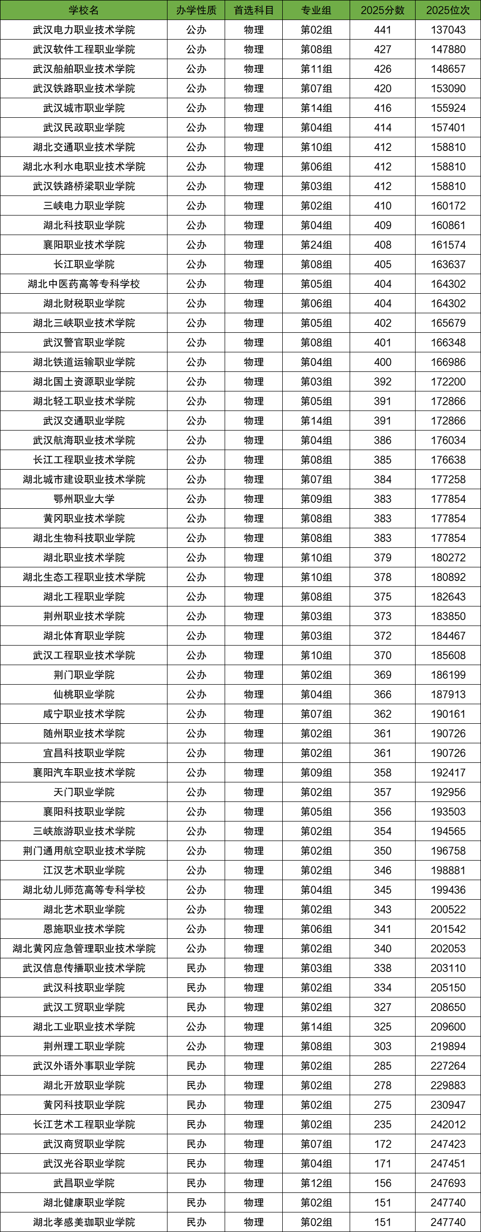 2025年湖北专科各大学在湖北物理类最低录取分数线位于151分-441分范围内,位次位于247740名-137043名之间。