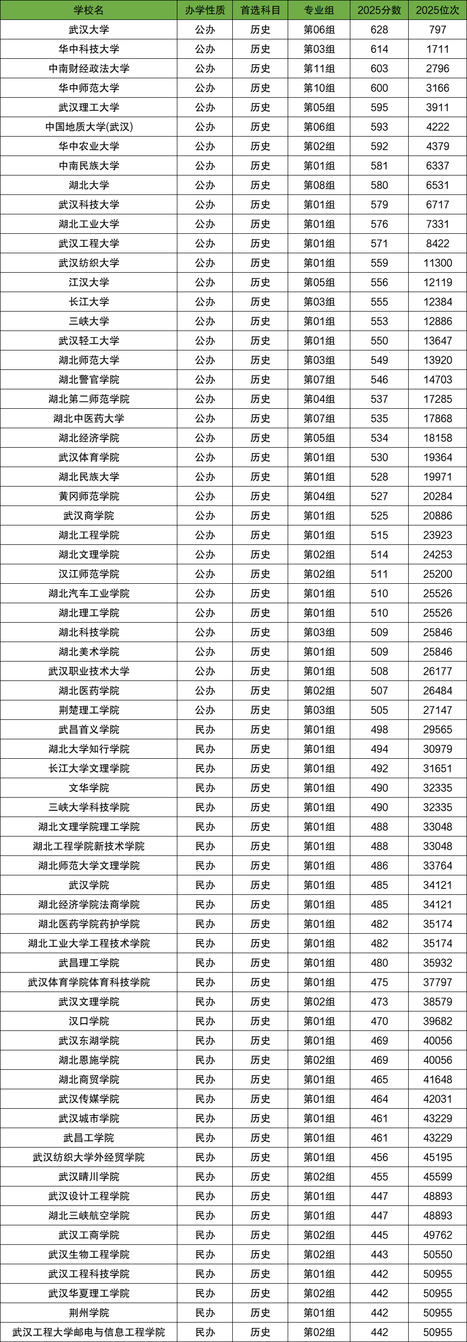 2025年湖北本科各大学在湖北历史类最低录取分数线位于442分-628分范围内,位次位于50955名-797名之间。