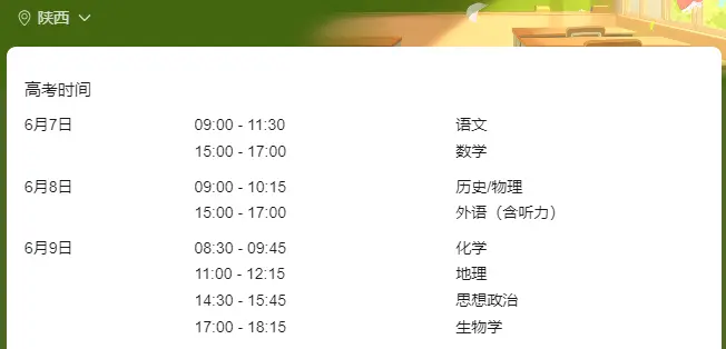陕西2025年高考时间安排在6月7日-6月9日,全国统考科目(语文、数学、外语)考试时间与其余省份一致,在6月7日-8日;选考科目考试时间由陕西省教育考试院安排在了6月8日-9日。