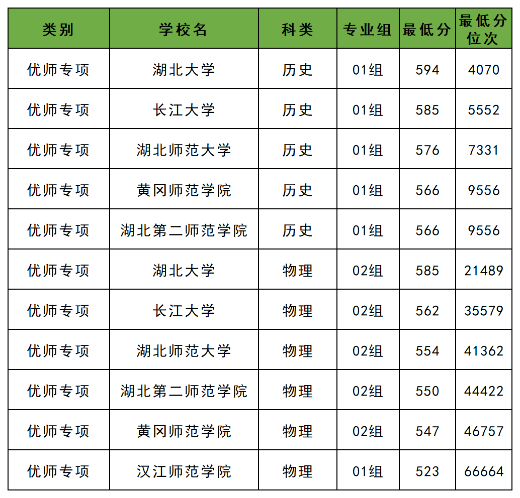 2025年湖北教育考试院公布本科提前批定向招生录取分数线,其中包含国家公费师范生和地方公费师范生院校专业组及其最低分(含优师计划),分数详情可见下: