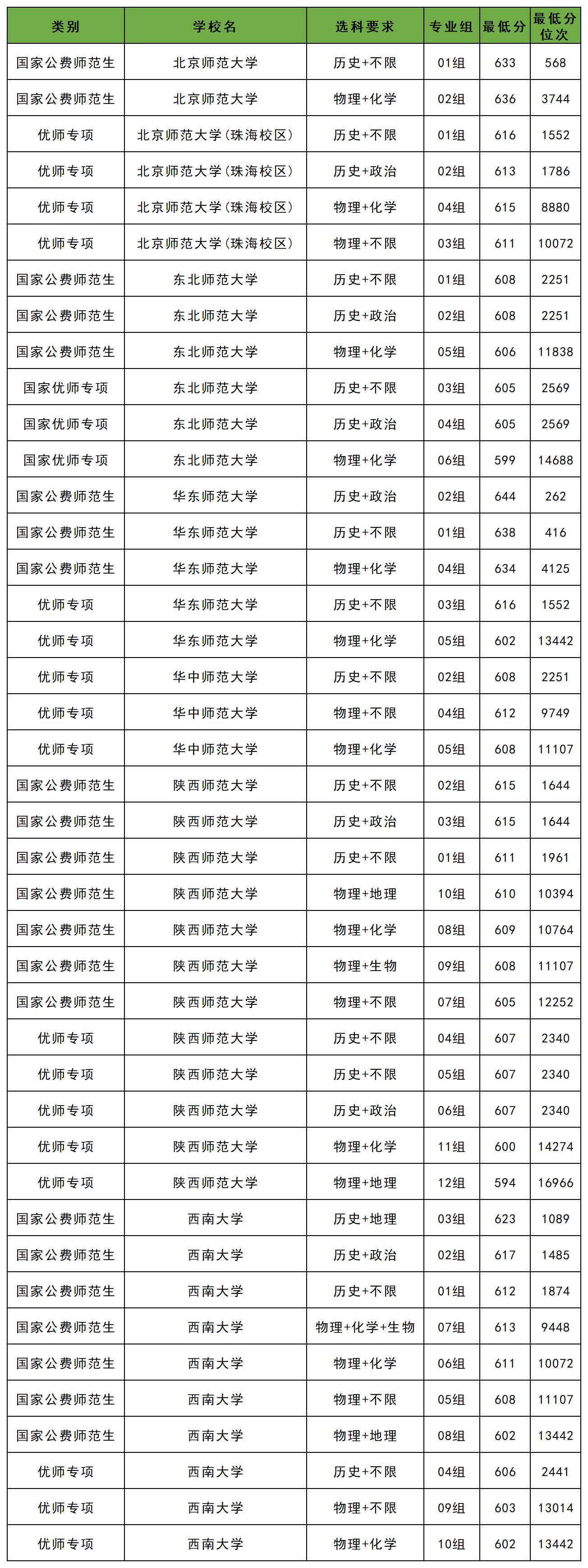 2025年湖北公费师范生(含优师计划)录取分数如下:北京师范大学(物理类)最低分611分,西南大学(历史类)最低分606分,华东师范大学(物理类)最低分602分等。