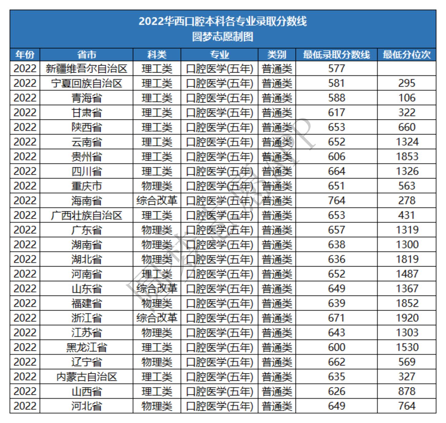 2022年华西口腔医学院口腔医学(5年制)专业录取分数线一览表: