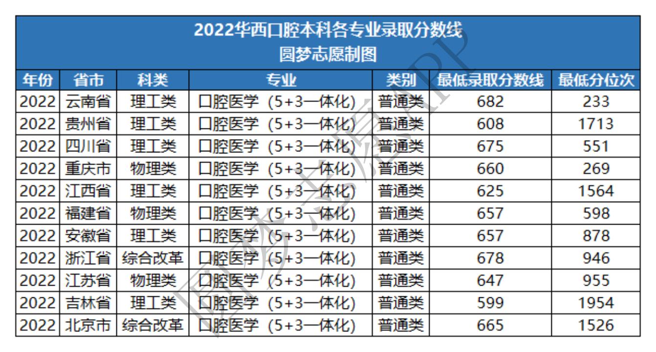 四川大学华西口腔医学院2022年面向全国31个省市招生的口腔本科专业共有5个,分别为口腔医学(5+3一体化)、口腔医学(5年制)、口腔医学(8年制)、口腔医学技术、口腔医学技术(口腔数字化技术双学士学位),华西口腔医学院的口腔各专业录取分数线基本上都超过了各省市本科批/本科一批控制分数线100-150分左右,对成绩的要求非常高,下文小编将为大家附上华西口腔本科各专业分数线,供大家参考: