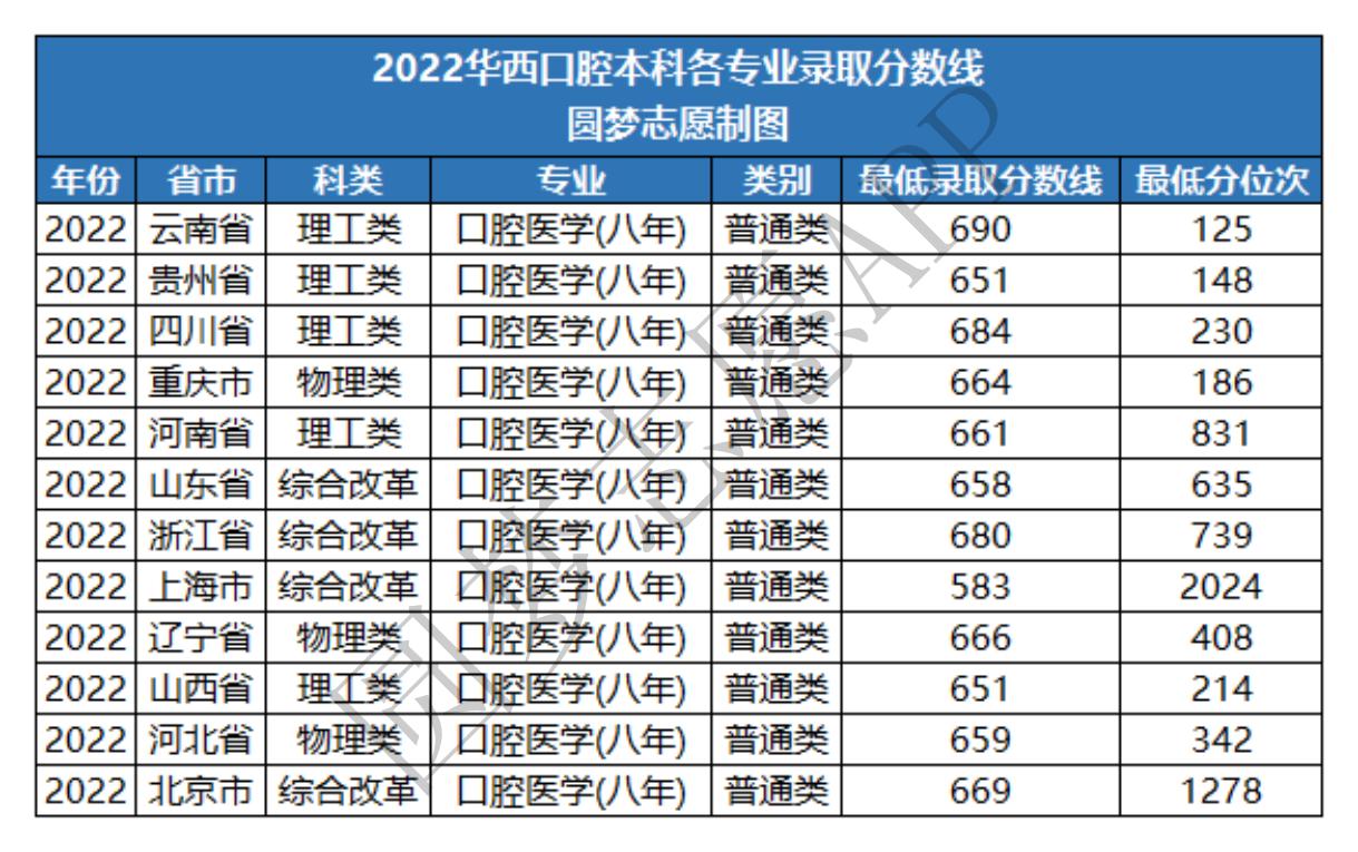 2022年华西口腔医学院口腔医学(8年制)专业录取分数线一览表: