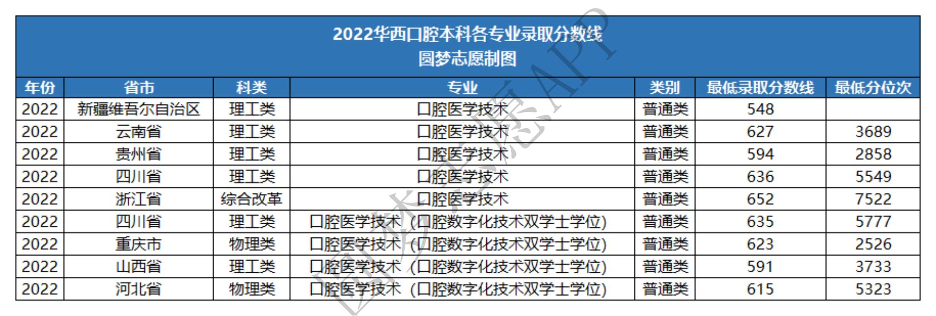 2022年华西口腔医学院口腔医学技术专业录取分数线一览表: