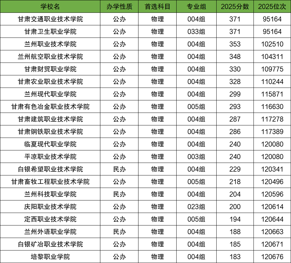 2025年甘肃专科各大学在甘肃物理类最低录取分数线位于183分-371分范围内,位次位于120676名-95164名之间。